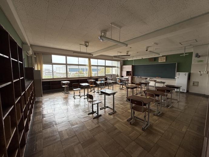 日立南太田ICから車で10分圏内の住宅街の中にある中学校です。校舎は4階建てとなっており、教室等の備品も残っています。