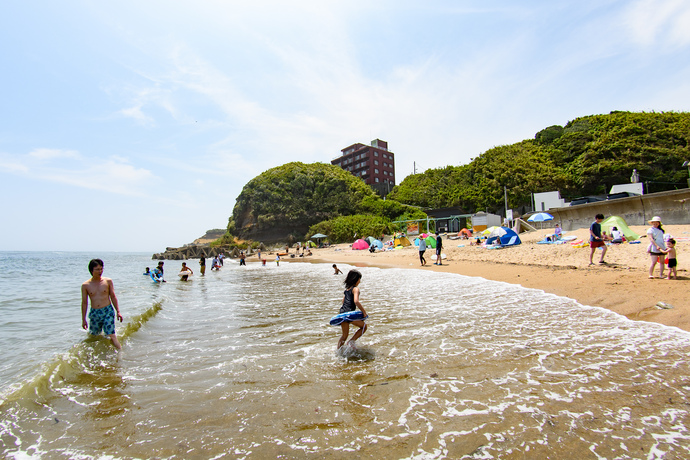 天然磯に囲まれた穏やかな海と、ベージュ系の色をした砂浜が特徴的な海水浴場です。