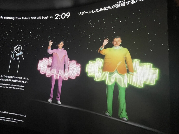 などを視察いたしました。「大阪ヘルスケアパビリオン」では、未来の健康測定体験装置である「カラダ測定ポッド」で簡易に測定された身体データや問診、脳トレクイズの結果などをもとに25年後の自分の姿(アバター)を作成。展示されている未来のヘルスケアや都市生活の疑似体験を実施した回数に応じて自らのアバターが若返るという「リボーン体験」を通して、ヘルスケアに関する知識の習得や日頃から健康を意識した生活を送ることの重要性を体験することができました。