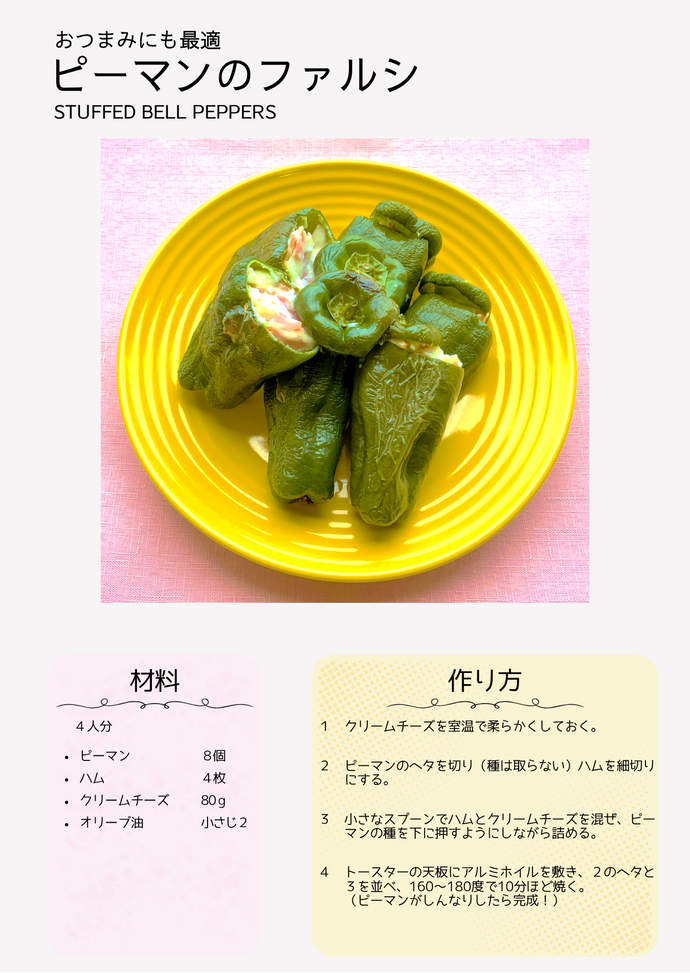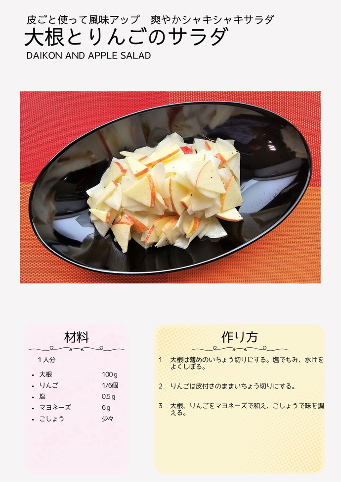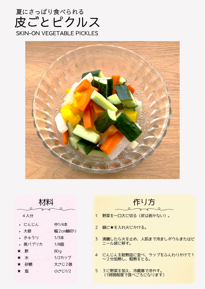 無駄なく食べよう!食品ロス削減レシピ ページID1017615 印刷大きな文字で印刷 料理の画像を選択するとレシピが表示されます。 第1弾(2025年8月更新) ピーマンのファルシ 皮ごとピクルス 第2弾(2025年9月更新) にんじんとりんごのケーキ 大根とりんごのサラダ 添付ファイル 01_ピーマンのファルシ (Png 582.2KB) 02_皮ごとピクルス (Png 631.0KB) 03_にんじんとりんごのケーキ (Png 630.0KB) 04_大根とりんごのサラダ (Png 653.8KB) このページについて、ご意見をお聞かせください。 このページの情報は役に立ちましたか。 役に立った どちらともいえない 役に立たなかった このページの内容は分かりやすかったですか。 分かりやすかった どちらともいえない 分かりにくかった このページは見つけやすかったですか。 見つけやすかった どちらともいえない 見つけにくかった ご意見がありましたら、ご記入ください。(200文字以内) 役に立った点や、分かりにくかった点などをご記入ください。 このフォームに入力されても回答いたしませんので、ご了承ください。 送信