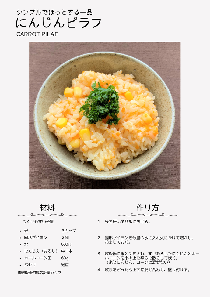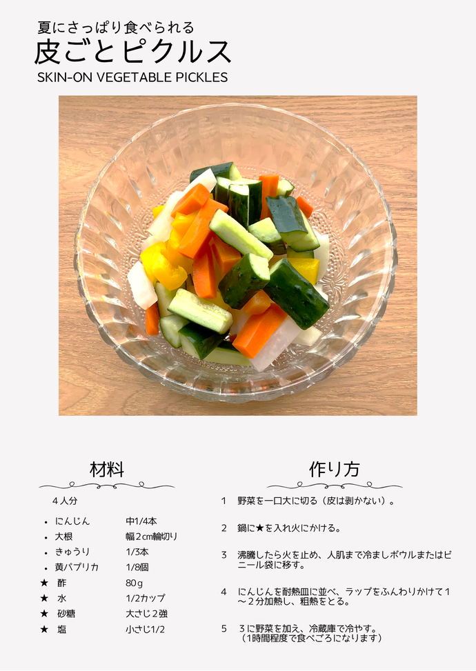 無駄なく食べよう!食品ロス削減レシピ ページID1017615 印刷大きな文字で印刷 料理の画像を選択するとレシピが表示されます。 第1弾(2025年8月更新) ピーマンのファルシ 皮ごとピクルス 第2弾(2025年9月更新) にんじんとりんごのケーキ 大根とりんごのサラダ 第3弾(2025年10月更新) 皮ごと長芋のガーリックステーキ 豚肉と長芋のピリ辛炒め 第4弾(2025年11月更新) にんじんドレッシング にんじんピラフ 添付ファイル 01_ピーマンのファルシ (Png 490.6KB) 02_皮ごとピクルス (Png 540.7KB) 03_にんじんとりんごのケーキ (Png 545.7KB) 04_大根とりんごのサラダ (Png 559.5KB) 05_皮ごと長芋のガーリックステーキ (Png 599.9KB) 06_豚肉と長芋のピリ辛炒め (Png 627.4KB) 07_にんじんドレッシング (Png 623.5KB) 08_にんじんピラフ (Png 560.2KB) このページについて、ご意見をお聞かせください。 このページの情報は役に立ちましたか。 役に立った どちらともいえない 役に立たなかった このページの内容は分かりやすかったですか。 分かりやすかった どちらともいえない 分かりにくかった このページは見つけやすかったですか。 見つけやすかった どちらともいえない 見つけにくかった ご意見がありましたら、ご記入ください。(200文字以内) 役に立った点や、分かりにくかった点などをご記入ください。 このフォームに入力されても回答いたしませんので、ご了承ください。 送信