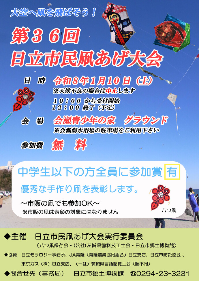 大空へ手作り凧を飛ばしましょう!日立市南部の伝統凧「八つ凧」の模範演技も行います。